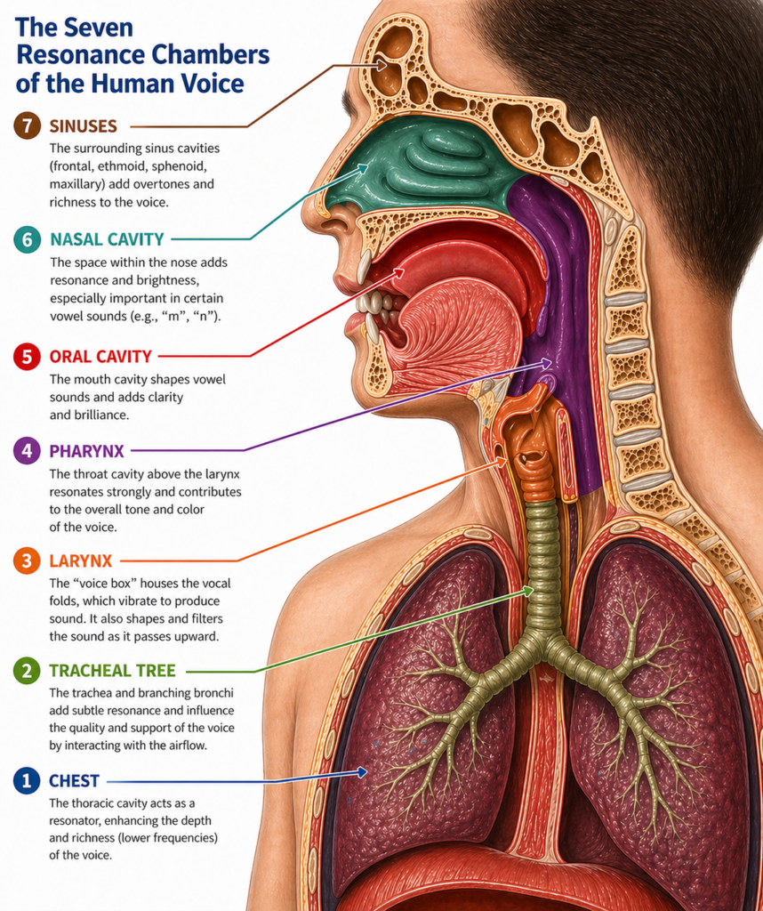 - The resonator is a set of seven chambers in the body providing amplification and tone coloration. The shape and size of these chambers are also unique to an individual and, along with the vocal folds, give each person their own characteristic voice sound. Primary resonance modes taking place in the head and/or chest lead to the eponymous head and chest “voices”. Another set of these chambers (e.g. aspects of your mouth) is capable of taking the sounds and forming them into consonants and vowels. See the color coded diagram below for exactly where these chambers lie in the human body.
